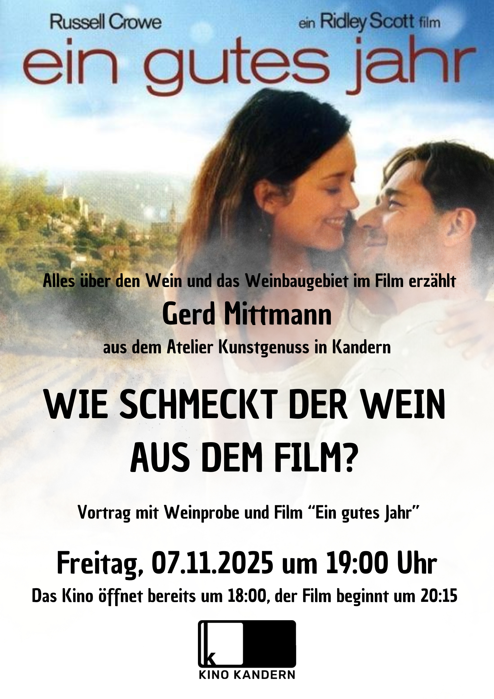 Am Freitag, 7. November feiern wir ab 18:00 Uhr Herbstfest im Kino. Dabei zeigen wir den Spielfilm "Ein gutes Jahr" in dem Wein getrunken wird. Woher … Weiterlesen